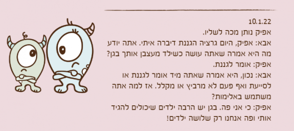 אבא: אפיק, היום גרציה הגננת דיברה איתי. אתה יודע מה היא אמרה שאתה עושה כשילד מעצבן אותך בגן?
