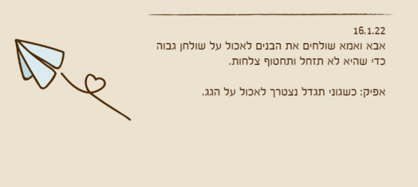 אבא ואמא שולחים את הבנים לאכול על שולחן גבוה כדי שהיא לא תזחל ותחטוף צלחות.