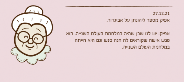 אפיק: יש לנו שכן שהיה במלחמת העולם השנייה. הוא פגש אישה שקוראים לה חנה סנש וגם היא הייתה במלחמת העולם השנייה.