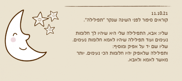 שליו: אבא, התפילילה שלי היא שיהיו לך חלומות נעימים ועוד תפילילה שיהיו לאמא חלומות נעימים.