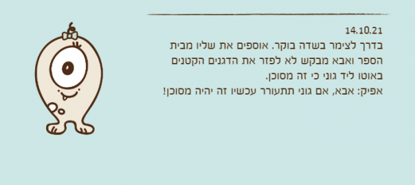 בדרך לצימר בשדה בוקר. אוספים את שליו מבית הספר ואבא מבקש לא לפזר את הדגנים הקטנים באוטו ליד גוני כי זה מסוכן.