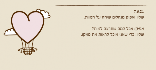 אפיק: אני לא רוצה שתמות לפניי. אני רוצה שנמות באותו הזמן.