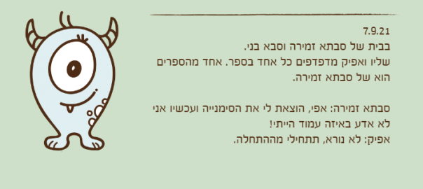 סבתא זמירה: אפי, הוצאת לי את הסימנייה ועכשיו אני לא אדע באיזה עמוד הייתי!