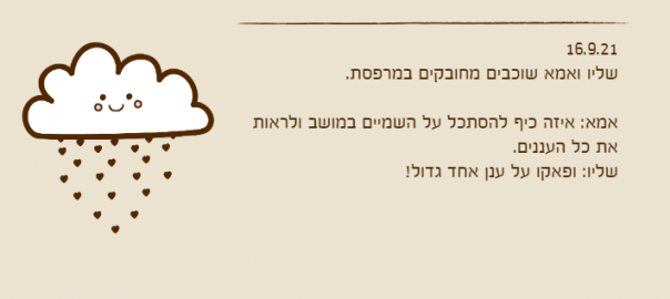 אמא: איזה כיף להסתכל על השמיים במושב ולראות את כל העננים.