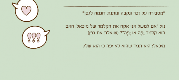 נוי: "אם למשל אני אקח את הקלמר של מיכאל, האם הוא קלמר יָפֶה או יָפָה"? )שואלת את גפן(