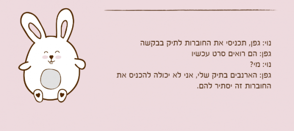 גפן: הארנבים בתיק שלי, אני לא יכולה להכניס את החוברות זה יסתיר להם.