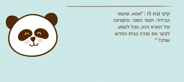 קיקי )בת 5( : "אמא, שיגמר הבידוד, ויגמר הסגר, והקורונה וכל החרא הזה, נוכל לנסוע לבקר את פנדה בבית החדש שלה? "