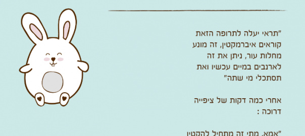 "תראי יעלה לתרופה הזאת קוראים איברמקטין, זה מונע מחלות עור, ניתן את זה לארנבים במיים עכשיו ואת תסתכלי מי שתה"
